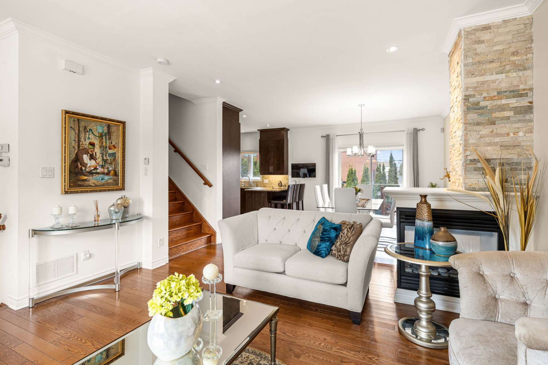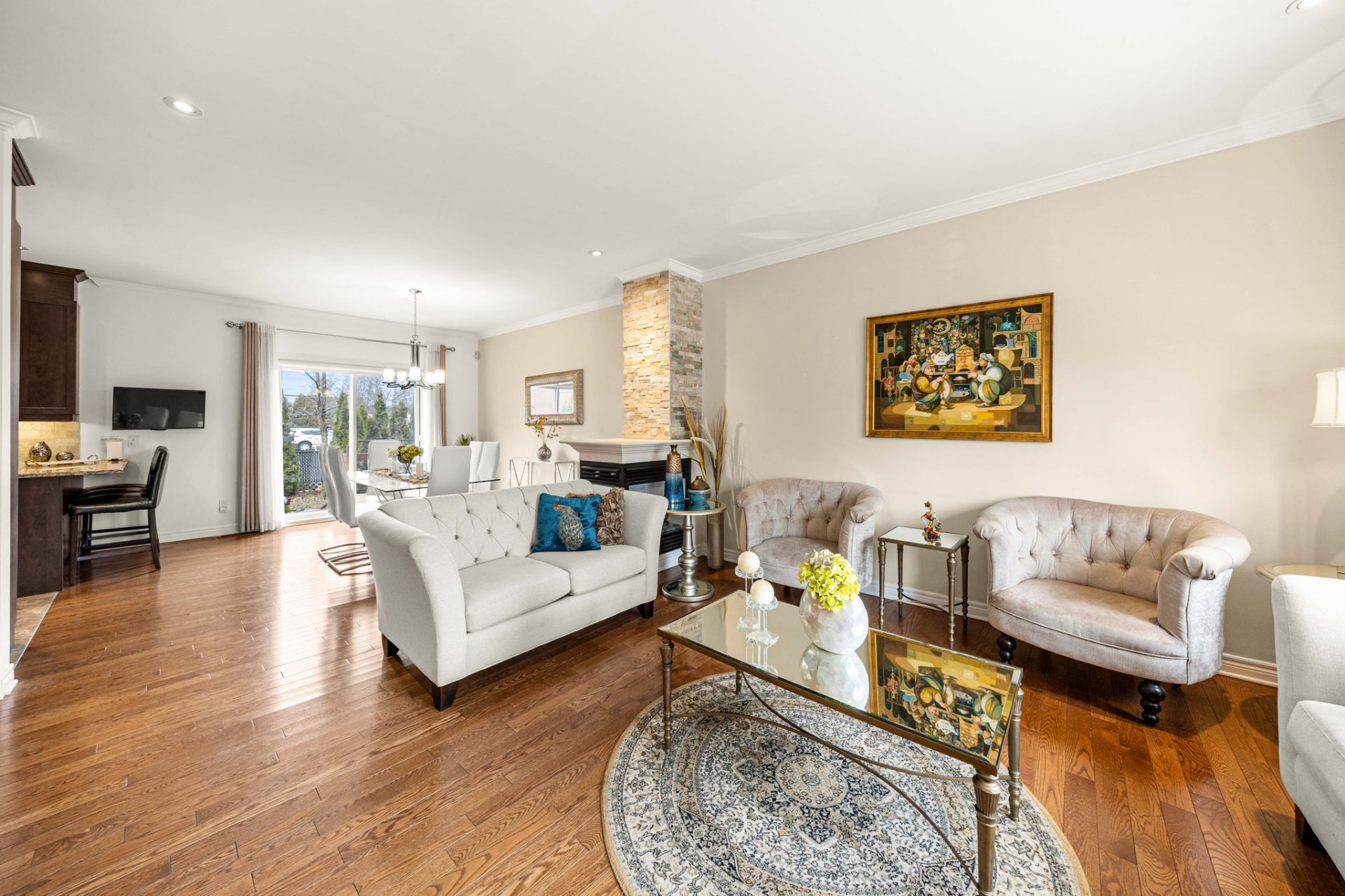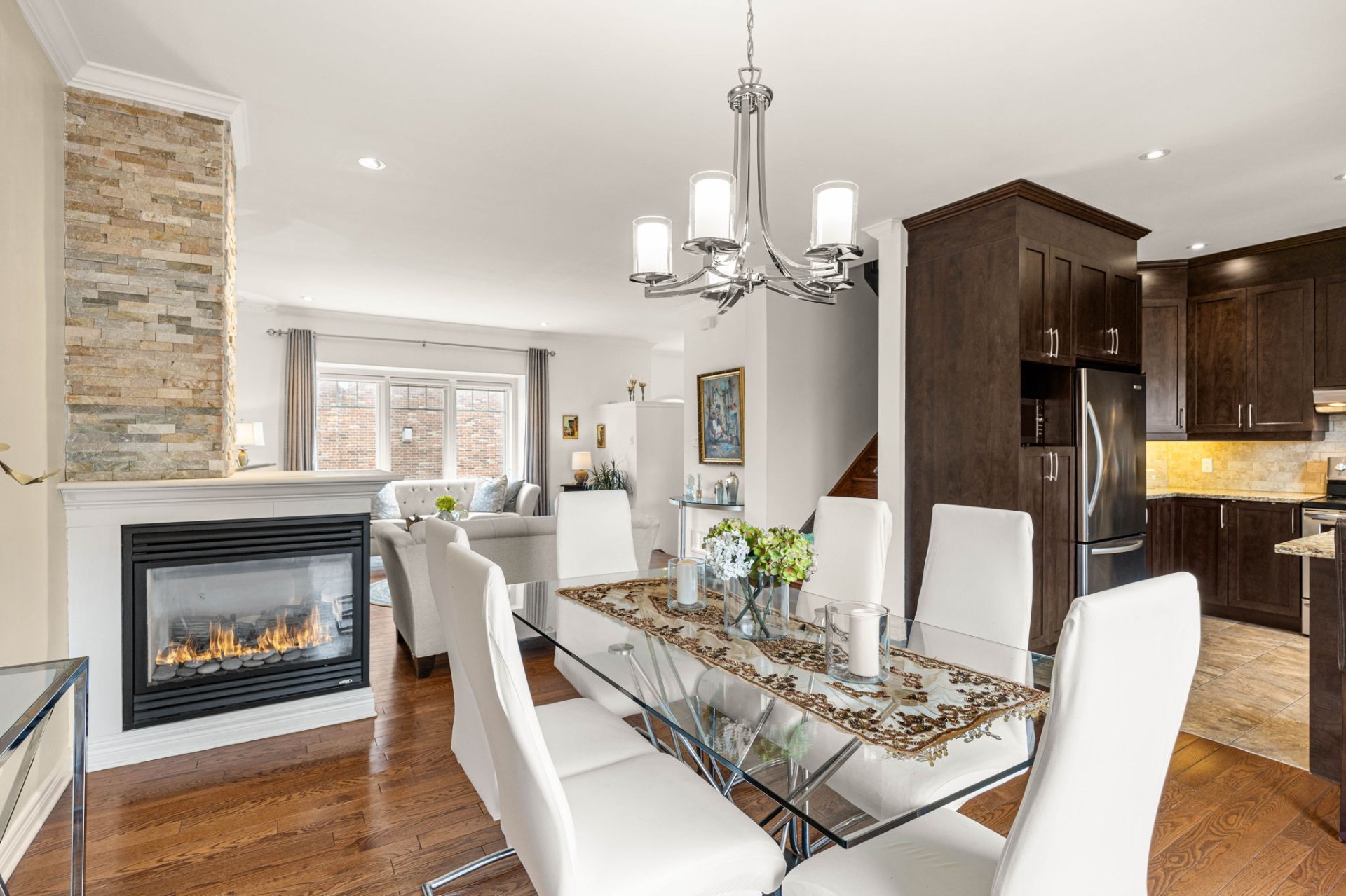 - Open-concept living and dining areas with a fireplace