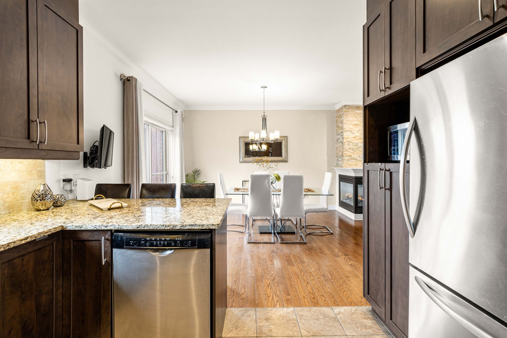 Inclusions : Fridge, Stove, Dishwasher, kitchen hood, all light fixtures, blinds, garage door openers (x2 remotes), central vacuum cleaner, alarm system, NEST thermostat, wall mounted TV bracket and TV in dining room area, third parking spot (#4188125) Garage parking, driveway parking + additional parking on the side of the house.