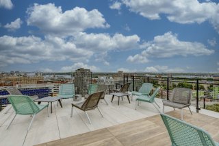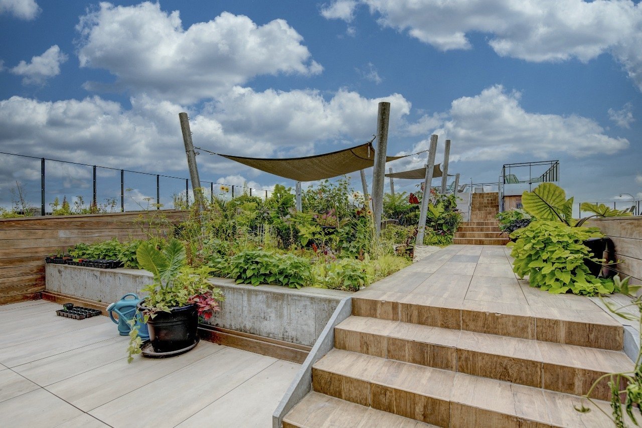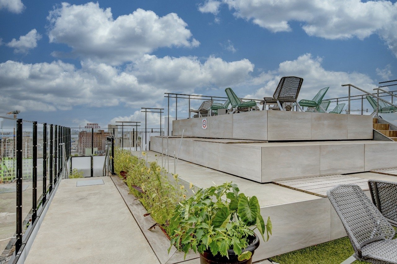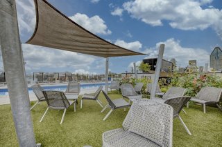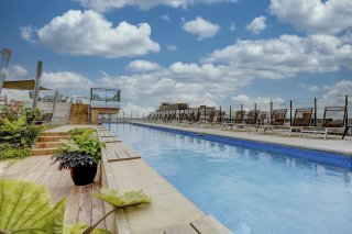 Rooftop terrace with pool, urban sand beach, lounge chairs,