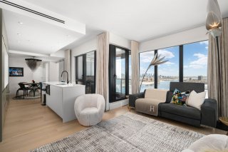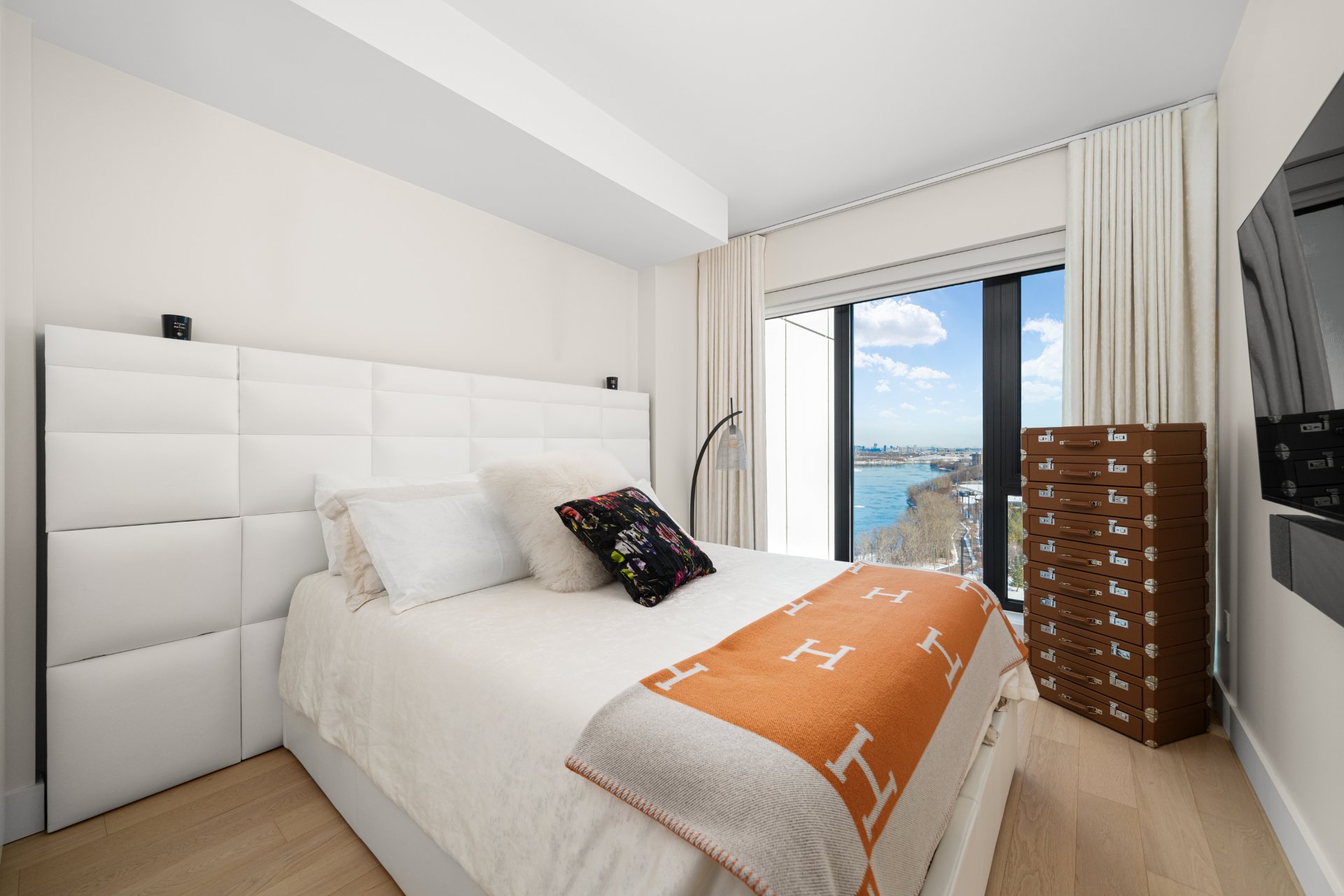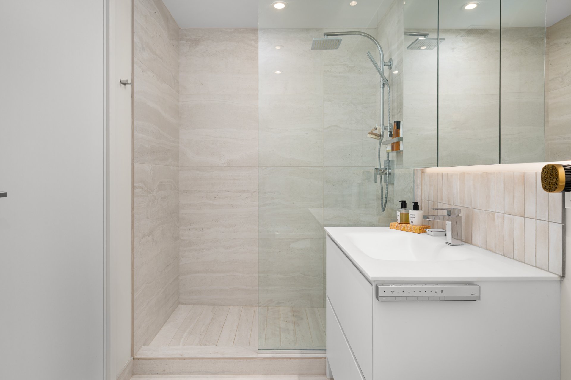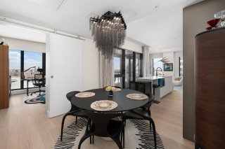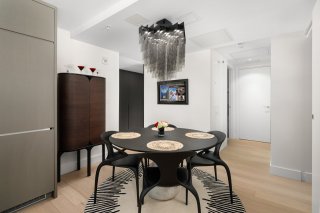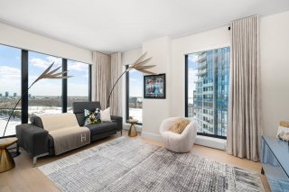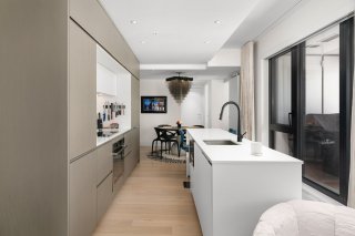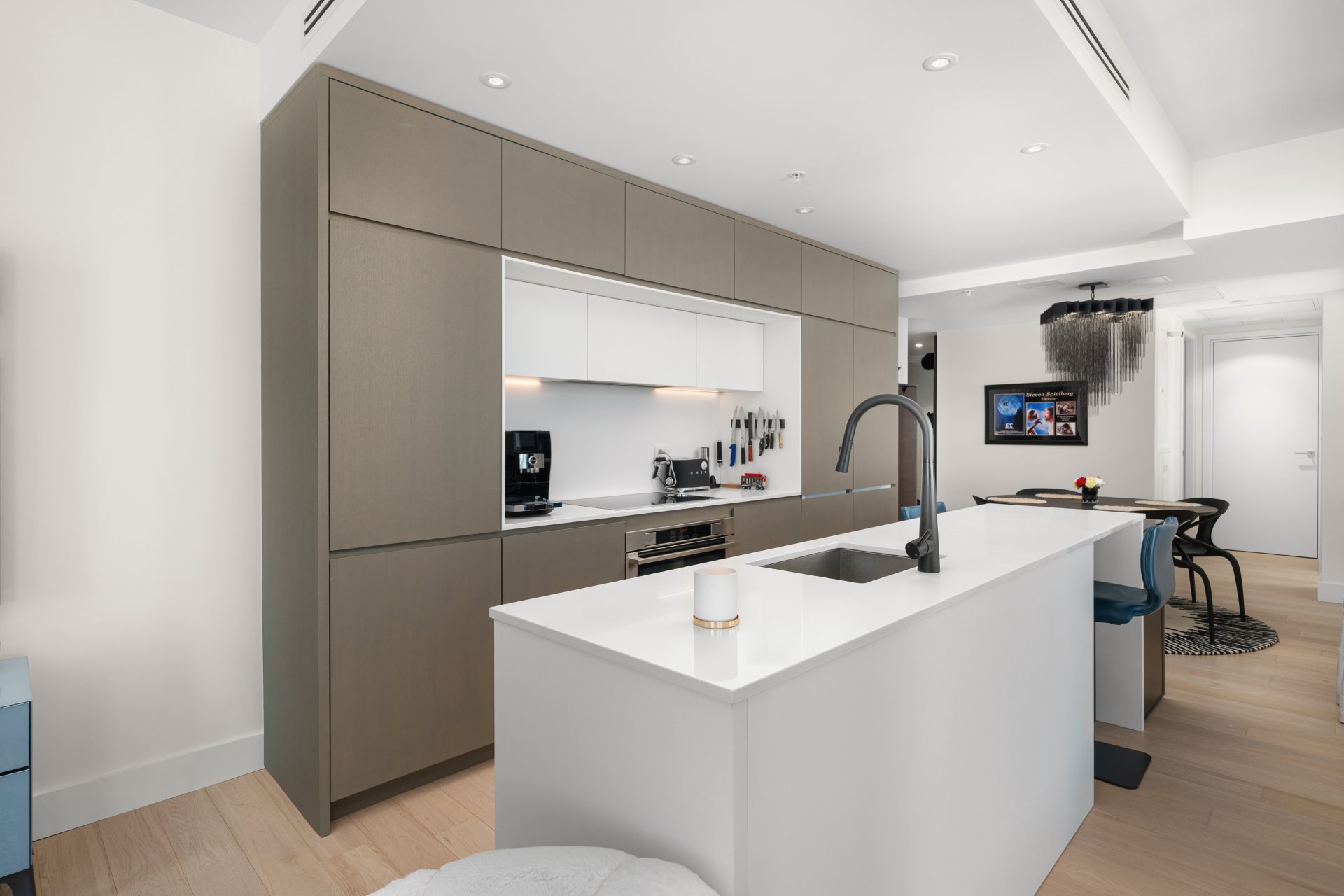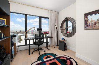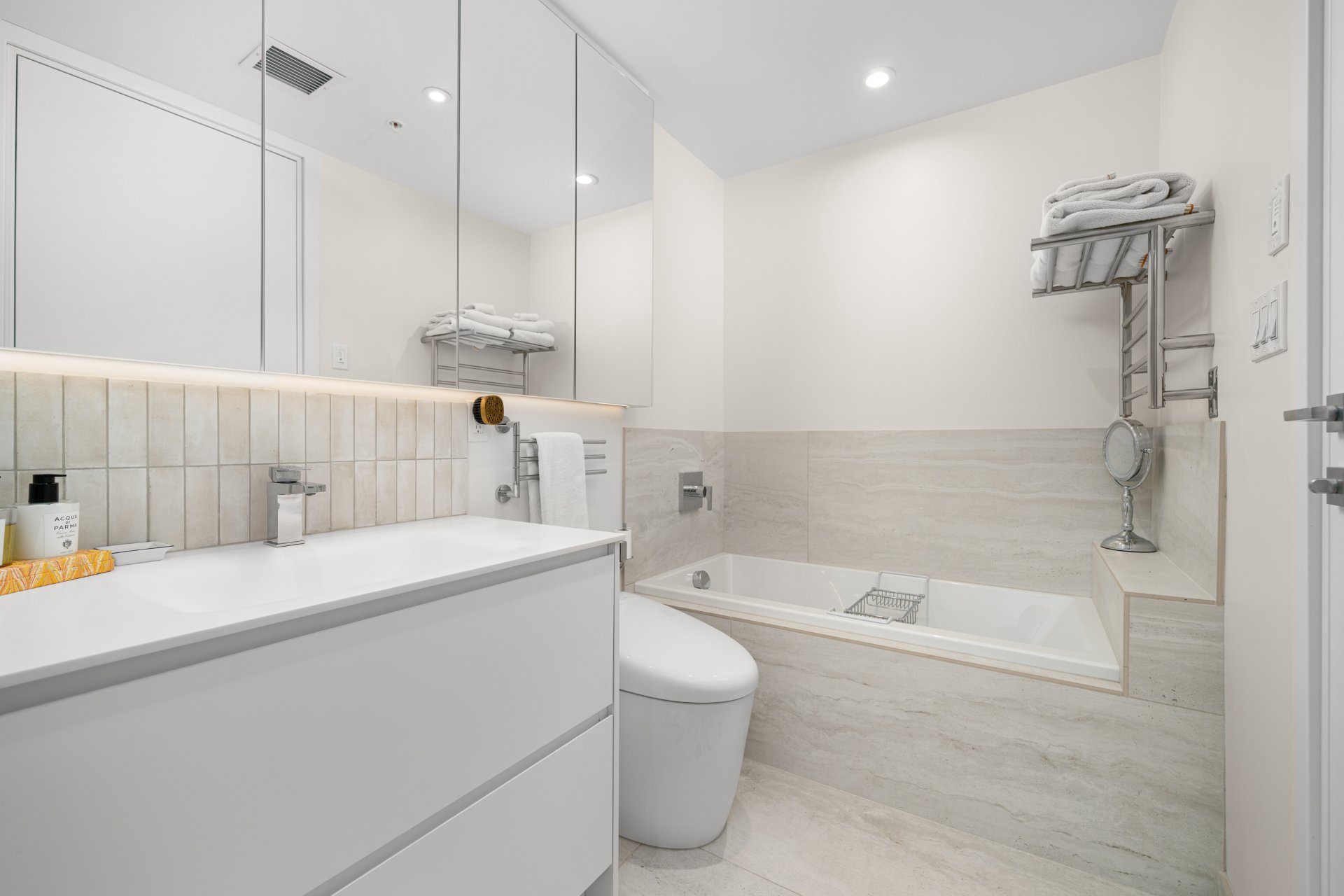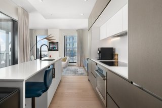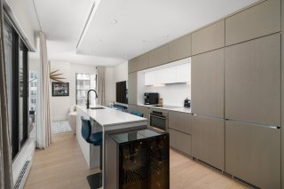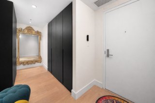Refined interior design elements, motorized blinds, and an artist-inspired dining light fixture Engineered wood flooring Custom built-in storage in the bedrooms and entry hall Quartz countertops, backsplash, and island Integrated high-end AEG appliances Dedicated enclosed space for high-end Miele washer and dryer TOTO toilet Bathrooms with sleek vanity, separate bath and shower Full-height mirrored medicine cabinets Solid wood front door and interior doors