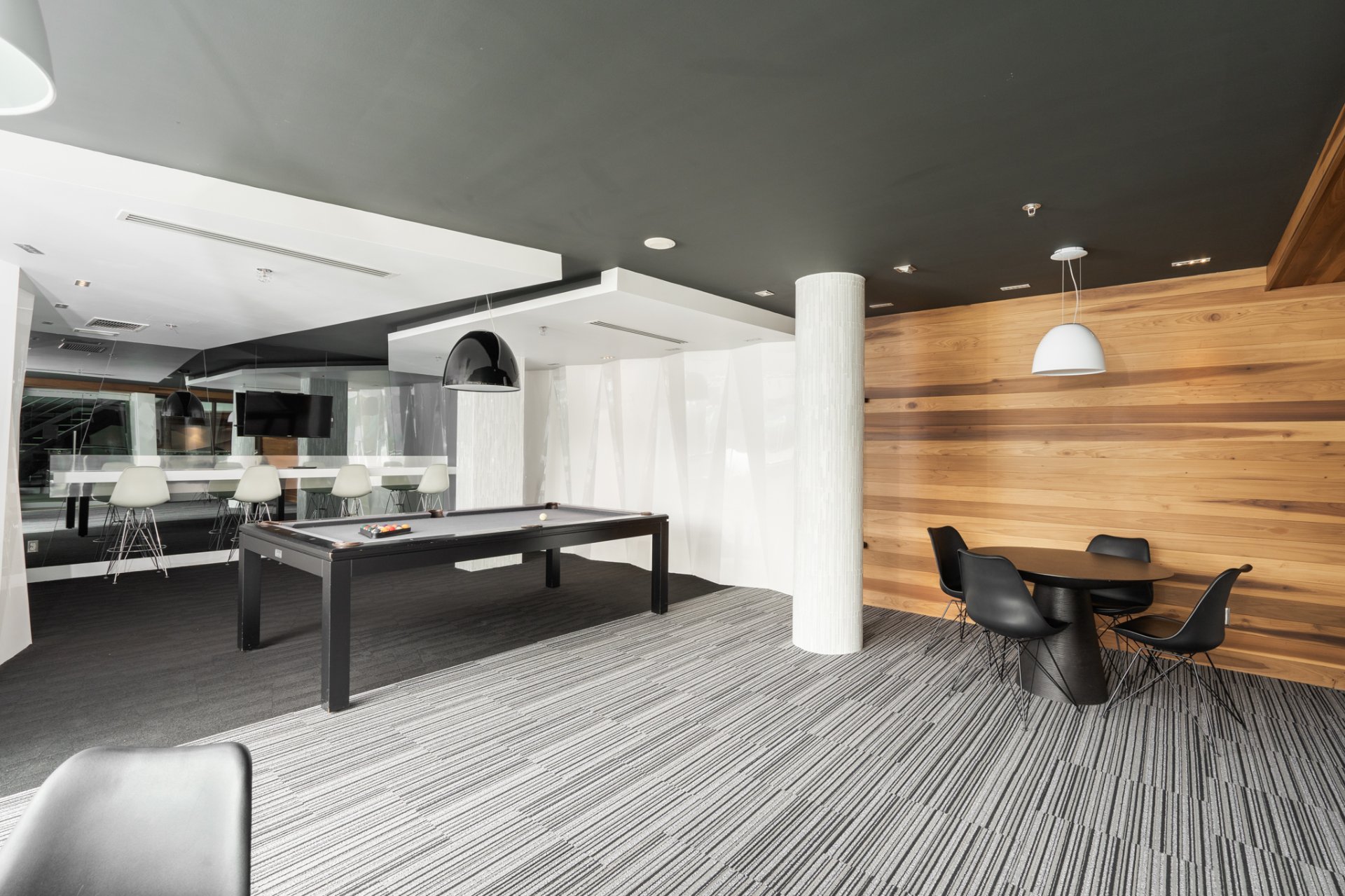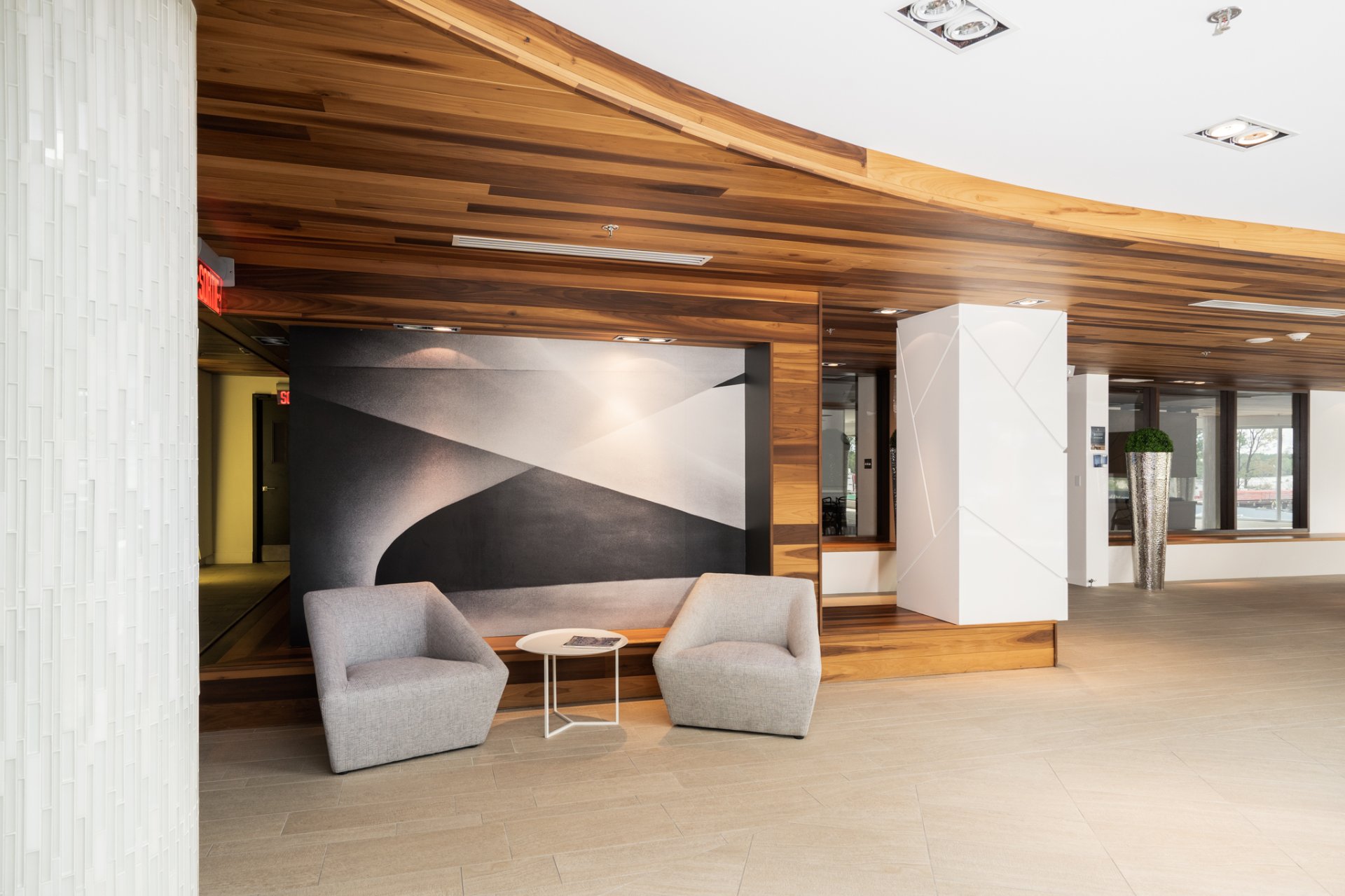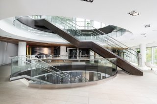 The building also stands out for its: Expansive panoramic windows Three elevators Concrete construction Automatic sprinkler system