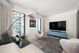 This bright 2-bedroom condo is ideally positioned to capture breathtaking, unobstructed views of the river, city skyline, and golf course through its full-height windows. The open-concept layout is both elegant and functional, featuring a modern kitchen with a large island and quality finishes, along with: