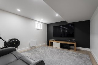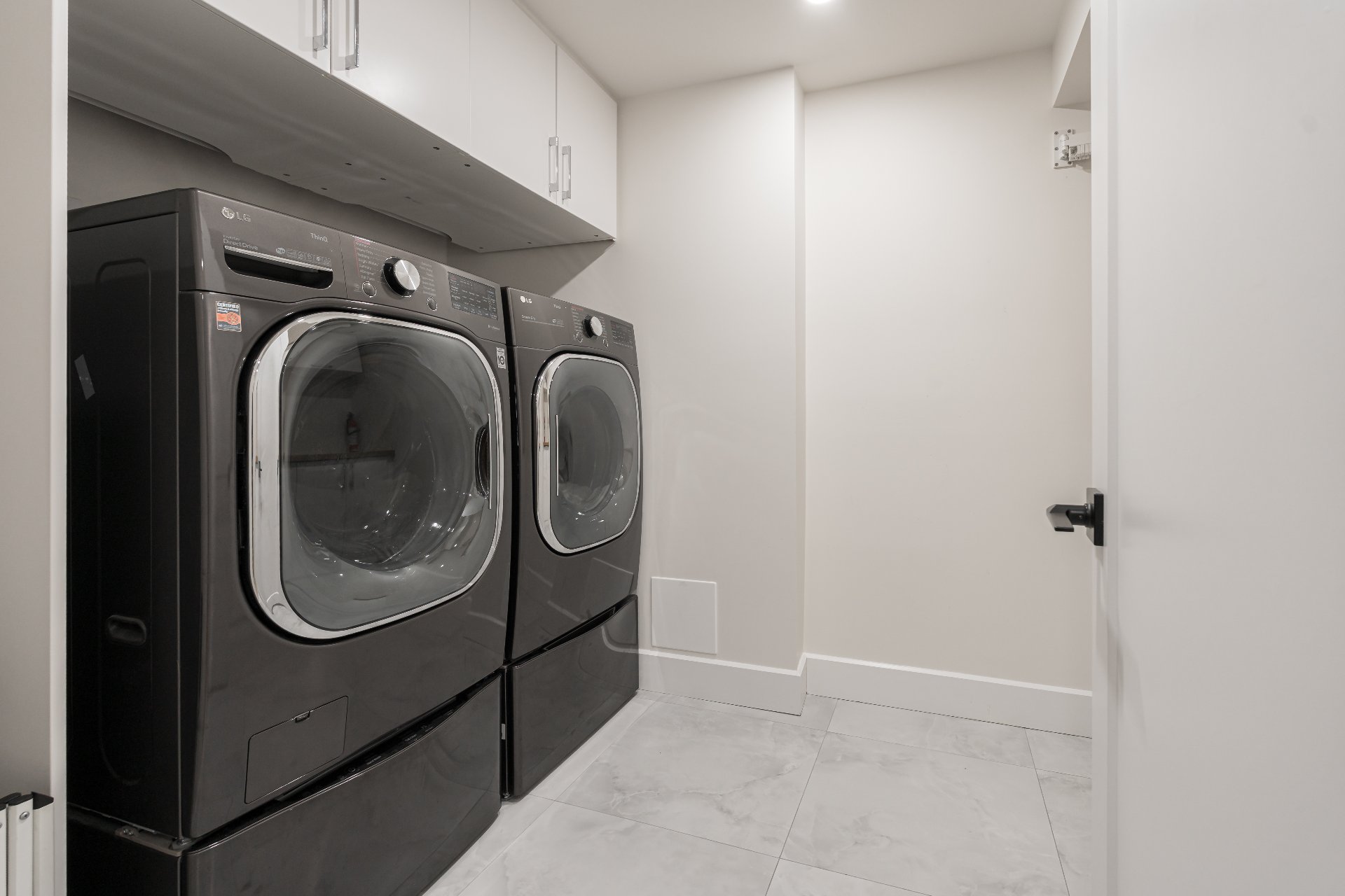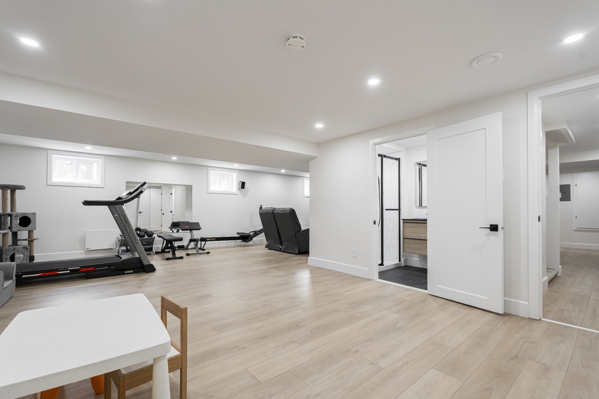 The basement, also fully redone, features a large family/playroom with vinyl floors, a dedicated laundry room (also with heated floors), and a bedroom.