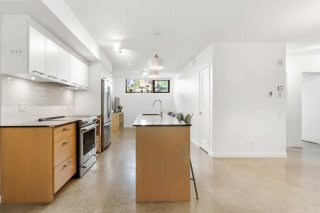 -Modern kitchen with large island, breakfast counter, and